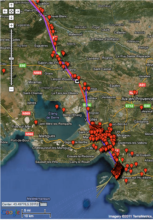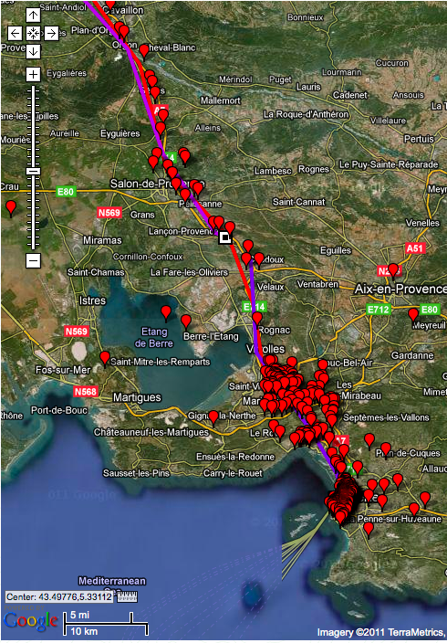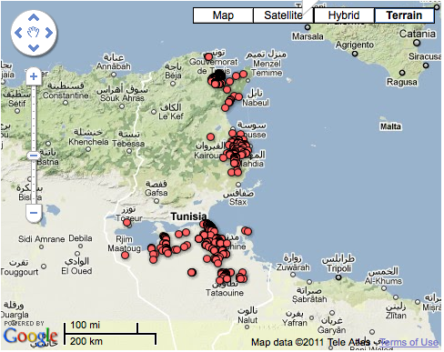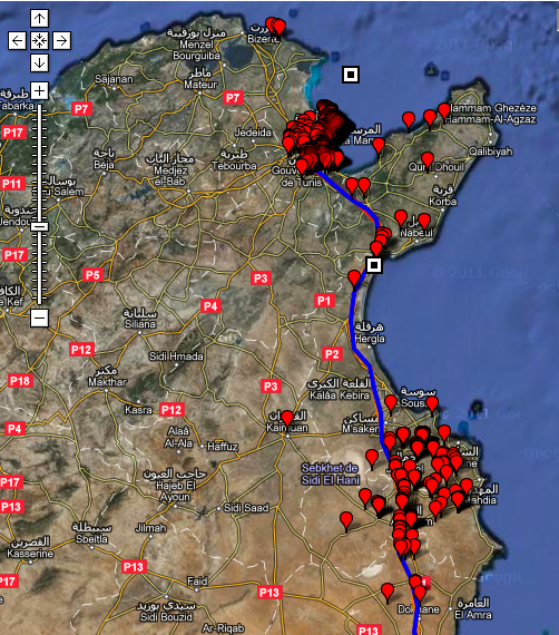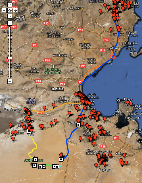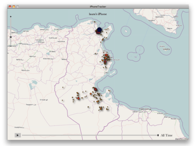 A comparison of the iPhone Tracker output with the raw data shows that the two maps look remarkably similar except for the size and color of the location points, so it isn’t clear how much the accuracy of the iPhone Tracker has been “reduced” for this data set anyway. Compare the maps below for the recorded locations in Tunisia.