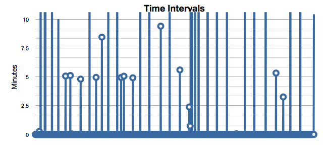 To better understand the scatter in the iPhone data, I took a look at the timestamps. The vast majority were the same even though information such as the Cellular Network, Cell ID and longitude/latitude was not! Assuming the format of the timestamp is NSDATE seconds (iPhone consolidated.db location tracking notes), I calculated the time intervals between adjacent rows. These are plotted below. Of the 3’161 rows in the sample, 14 points were recorded at intervals of over 1 hour, 44 were recorded at intervals of less than 1 hour. As shown, the interval between measurements is variable. I did not detect any pattern or obvious trigger for recording information with different timestamps.
