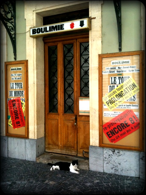 I snapped this picture while I was walking around town at lunchtime this week. As cats will, this one seems to own the entrance to the Théâtre Boulimie in Lausanne. Boulimie has the same meaning as bulimia in English. Although the cat’s attitude reminds me a little more of phlegm, as do cats in general, the posture of the cat and the name of the theatre struck me as appropriate.