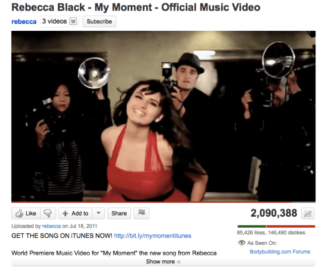 I’m happy. Happy for Rebecca Black, and yes more than a little happy to see that all those so-called music and Internet pundits who thought that it was so awful and that everyone hated it were wrong. All wrong.