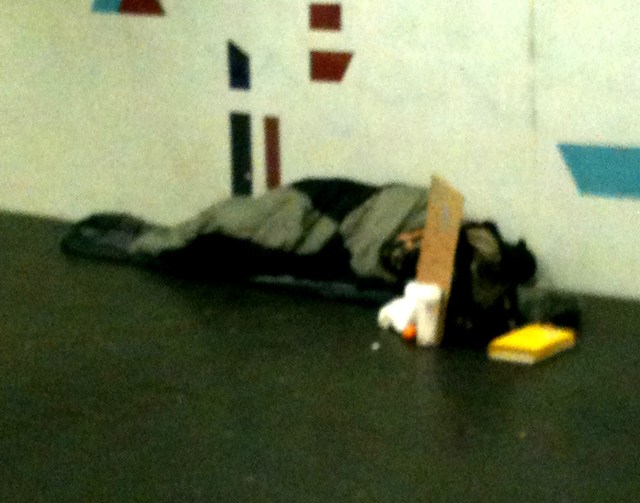It was rainy, cold and windy. Just beyond the entrance, well-sheltered from the elements, a homeless person was still asleep in his sleeping bag beside the wall. It was the same young person I saw sleeping outside on the bench beside the bus stop a few weeks ago.