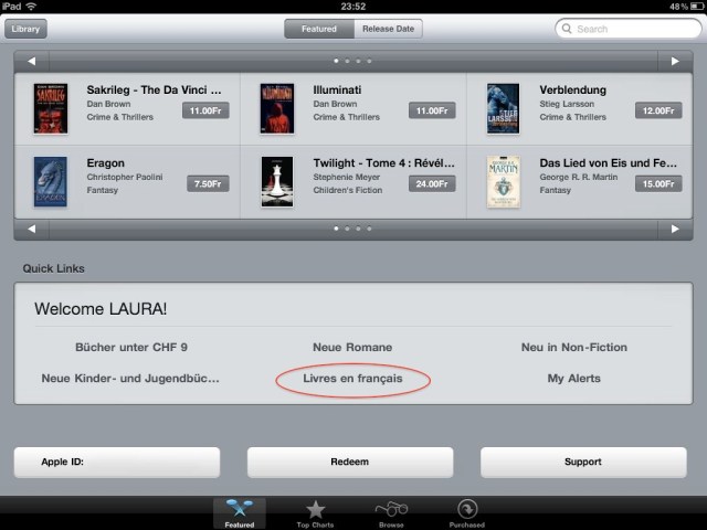 When the Swiss iBookstore opened about two months ago, I posted some screensnaps. It’s obvious from those that my iPad knew I wanted my interface to be displayed in English: all the menus are in English. Further, as this snap shows, although the default store comes up in German, there was at least a link to the French version of the store at the bottom of the Featured selections: