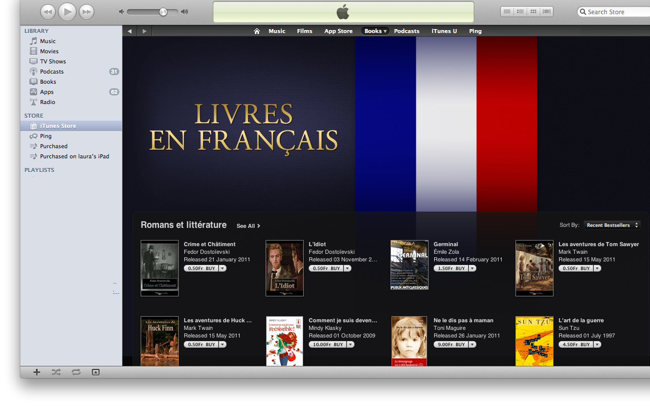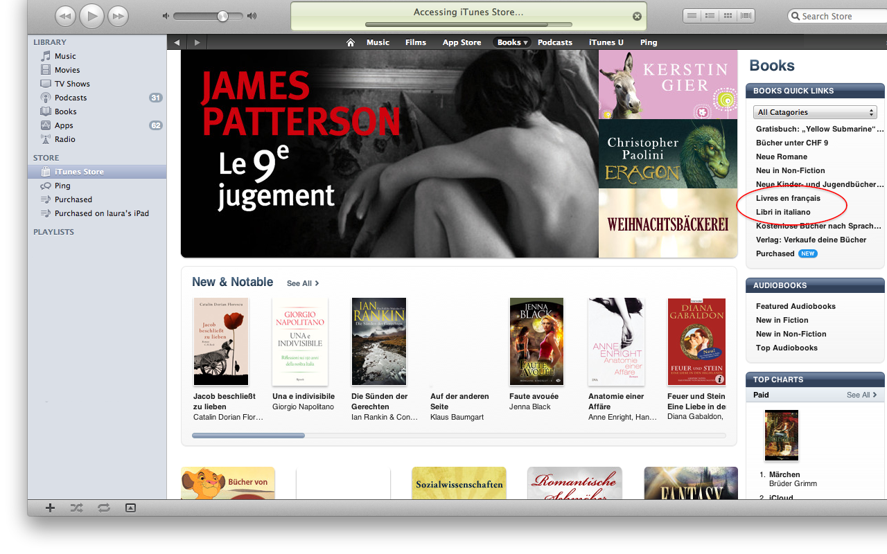 Accessing the iTunes store from my MacBook, I found the familiar English interface, as well as links to browse the store in French and Italian!