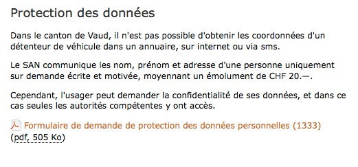 In the Canton of Vaud, it is not possible to obtain the address of the owner of a vehicle in a directory, via internet or via sms.