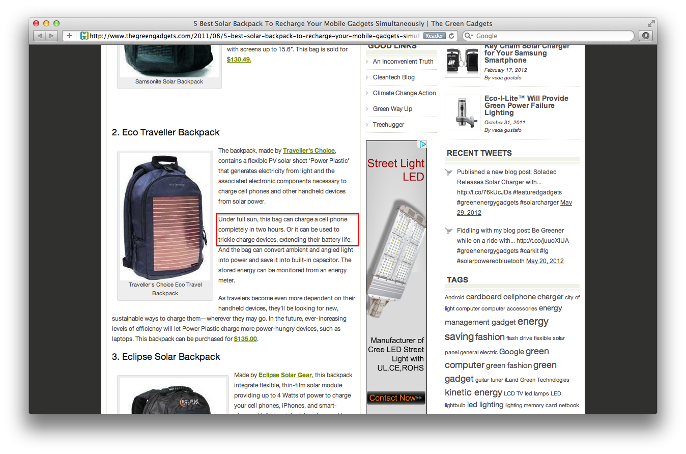 Konarka’s own Travelers Choice case study document gives the same information. Of course it’s hard to compare since most of the time I was charging the backpack late in the day when the solar irradiance was low, but my bag was in full sun just after midday during several hours and the green LED didn’t turn on.
