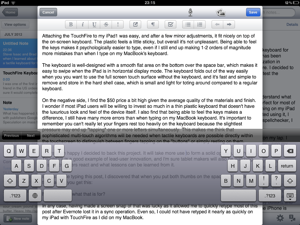 In any case, having made a screen snap of that was lucky because it allowed me to quickly retype most of this post after it was lost it in an Evernote sync operation. Even so, I could not have retyped it nearly as quickly on my iPad with TouchFire as I did on my MacBook.