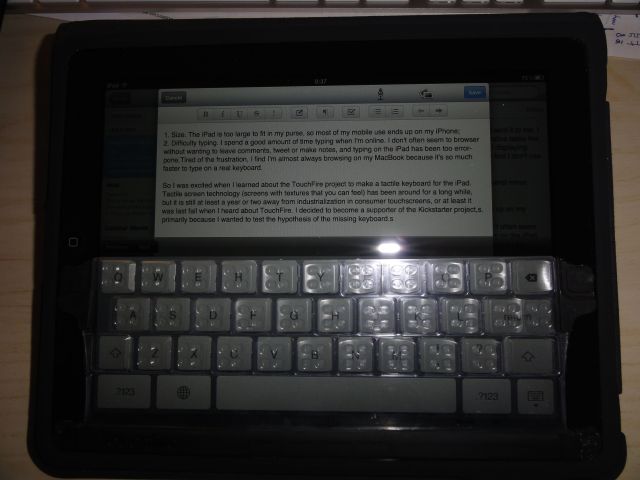 So I was excited when I learned about the TouchFire Kickstarter project to make an on-screen keyboard overlay for the iPad. Tactile screen technology (screens with textures that you can feel, as opposed to touch responsive screens) has been around for several years in the lab as a proof-of-concept, but it is still at least a year or two away from industrialization in consumer devices, or at least it was last fall when I heard about TouchFire. I decided to become a supporter of the project, primarily because I wanted to test the hypothesis that I’d use an iPad more frequently if it had a better keyboard. I also thought it would give me some first-hand idea about what using one of the tactile screens might be like when they finally come to market.