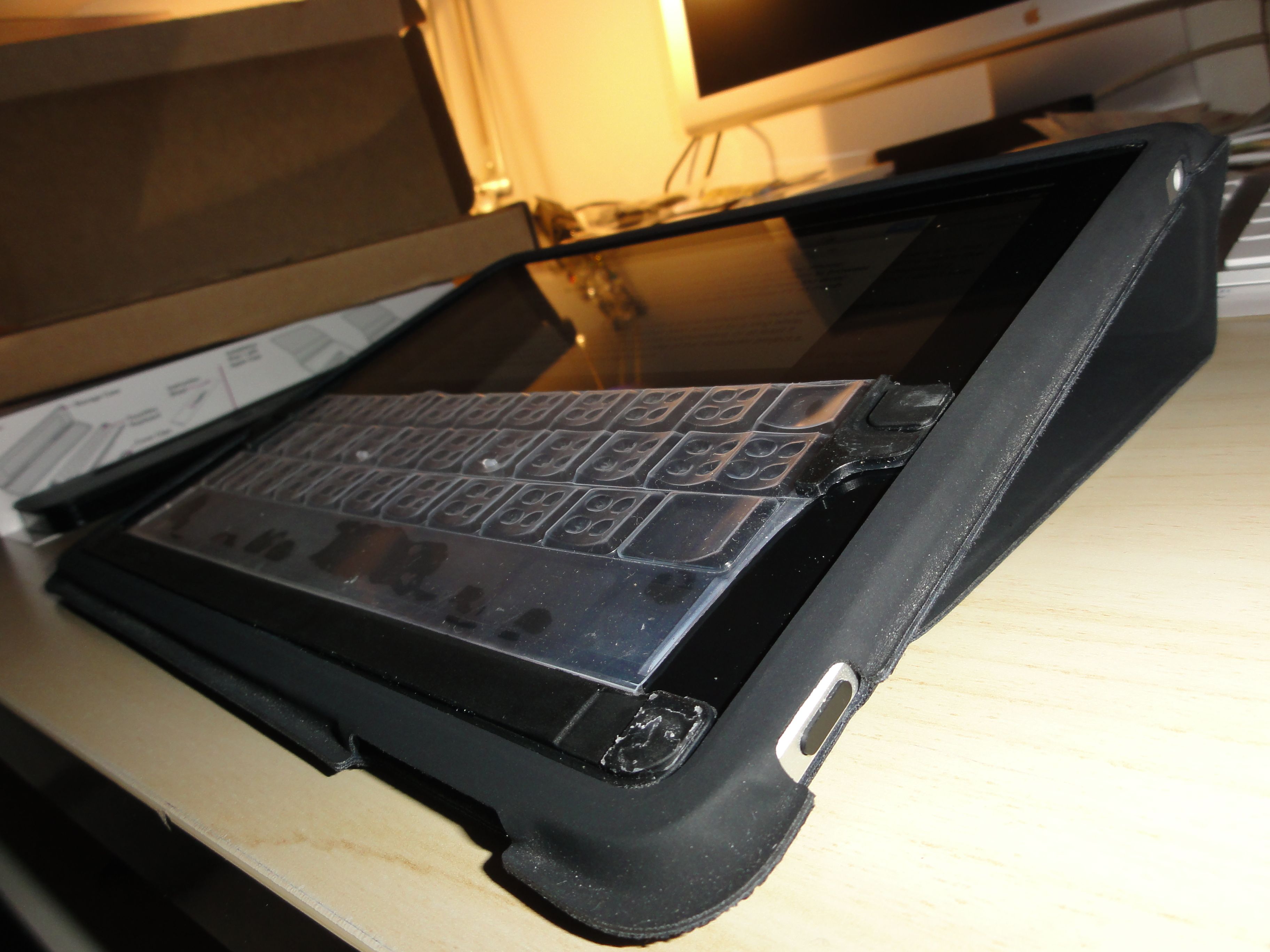 There are a few drawbacks though. I find the $50 price a bit high given the average quality of the materials and finish. I wonder if most iPad users will be willing to invest so much in a thin plastic keyboard that doesn’t have the luxurious look and feel of the device itself. While I find that being able to feel the keys makes a difference, I still have many more errors than when typing on my MacBook keyboard. It’s important to remember you can’t really let your fingers rest too heavily on the keys because the slightest pressure may end up “tapping” one or more letters simultaneously. This makes me think that sophisticated multi-touch algorithms will be needed to implement keyboards on tactile touch screens in order to distinguish between fingers tapping on the “buttons” or simply resting on them. That should be an interesting technical challenge for the engineers.