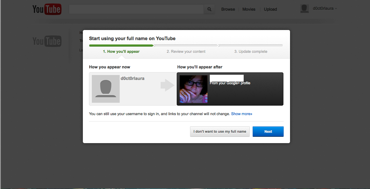 It’s been a while since I logged in to my personal YouTube account, but when I did so a little while ago, I found out that YouTube wants me to start using my full name.