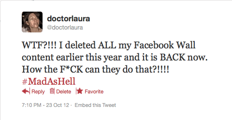 Yesterday, almost nine months later, I logged in for the first time since January. To my surprise, my entire timeline, including all of my earlier posts painstakingly deleted one-by-one by hand, was there as if it had never been removed. I was spitting mad (hence the language):
