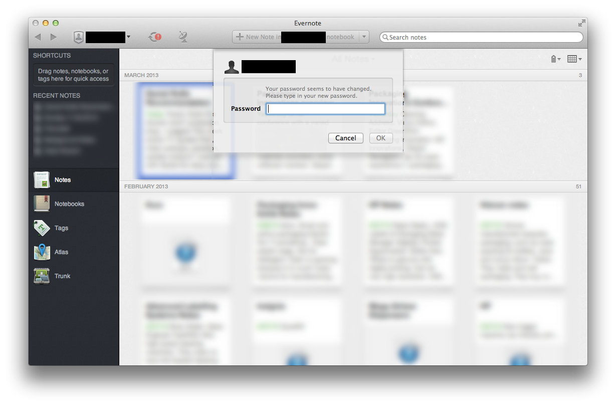Yesterday, as a result of having discovered a concerted attempt to access secure areas of the Evernote Service platform, Evernote triggered a system wide password reset. According to this blog post, they found no evidence that any user content was accessed, changed or lost, nor any evidence that payment information was compromised. I assume that means credit card information.